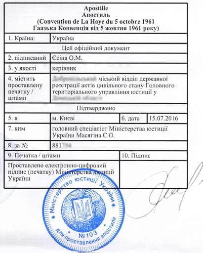 В Україні апостилізацію проводить уповноважений державний орган – Міністерство юстиції (свідоцтва про народження, шлюб, розлучення та інші), Міністерство освіти і науки (дипломи, атестати, сертифікати), Міністерство закордонних справ (довідки про несудимість, про інвалідність, медукладення та видані неповносправних ЗЗ). Після проходження такої процедури їх можна використовувати без необхідності проходження додаткової консульської легалізації.